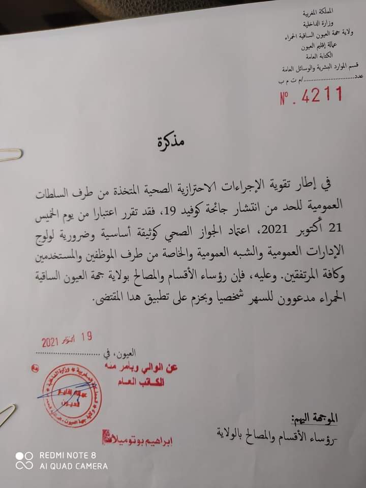 أصدرت ولاية جهة العيون الساقية الحمراء مذكرة قررت من خلالها أنه اعتباراً من يوم الخميس 21 اكتوبر 2021، سيتم اعتماد جواز التلقيح كوثيقة أساسية وضرورية لولوج الادارات العمومية والشبه العمومية والخاصة.