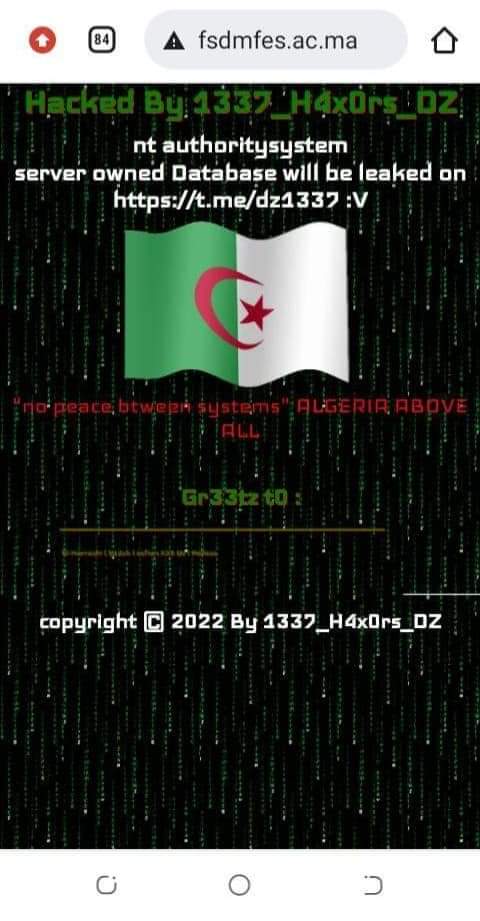 تعرض الموقع الإلكتروني لكلية العلوم ظهر المهراز بفاس، التابعة لجامعة سيدي محمد بن عبد الله، مساء أمس الجمعة، للاختراق من قبل “هاكرز” جزائریین، عملوا على تعطيل خدمات الموقع ونشر العلم الجزائري على واجهته بالشبكة العنكبوتية.