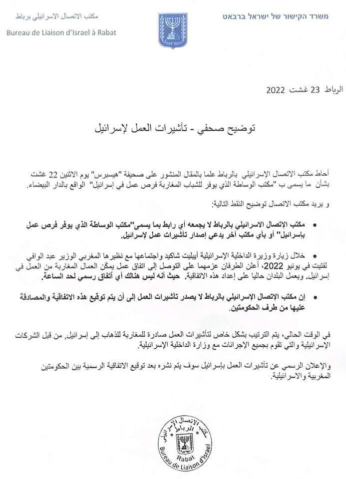 نص البلاغ التوضيحي الصادر عن مكتب الاتصال الإسرائيلي بالرباط
