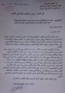 وجه ماء العينين الصادق العضو بالمجلس الجماعي لأكادير ،يومه الإثنين طلبا إلى رئيس المجلس الجماعي لأكادير ، من أجل إدراج نقطة في جدول أعمال الدورة المقبلة تتعلق بإقالة السيد عزيز أخنوش ، نظرا لتغيباته بصفة متقطعة ودون مبرر يقبله المجلس ،حيث يعتبر في نظر القانون مقالا ، ويجتمع المجلس لمعاينة هذه الإقالة من عضوية المجلس الإداري للجماعة .