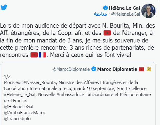 ونشرت السفيرة لوغال على حسابها بموقع التواصل الاجتماعي “تويتر” تغريدة ، قالت فيها : ” بعد فترة 3 سنوات، تذكرت الاجتماع الأول مع وزير الخارجية ناصر بوريطة ثلاث سنوات كاملة من الشراكات والاجتماعات .. شكرا”.
