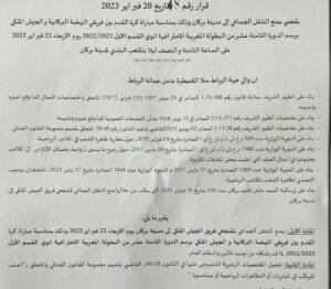 أصدر محمد اليعقوبي والي جهة الرباط سلا القنيطرة ، قرارا يمنع بموجبه التنقل الجماعي الى مدينة بركان بمناسبة إجراء مباراة كرة القدم بين نهضة بركات والجيش الملكي برسم الدورة الثامنة عشرة من البطولة المغربية الإحترافية في القسم الأول 2022/2023 والتي ستجرى غدا الأربعاء 22 فبراير على الساعة الثامنة والنصف مساءا بالملعب البلدي لمدينة بركان .