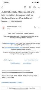 في أول رد فعل من نوعه منذ افتتاح مكتب الاتصال الإسرائيلي بالمغرب قبل تلات سنوات عقب توقيع اتفاقية استئناف العلاقات بين المغرب وإسرائيل ، ومنذ اعتلاء ومغادرة السيد غوفرين المكتب نحو بلده ، و الذي لم تظهر بعد نتائج التحقيقات بشأن إتهامه بالتحرش الجنسي داخل المكتب ، وبعد تفويض ألونا فيشر كام خلفا لغوفرين ، ستتوصل هذه الأخيرة بداية الأسبوع المقبل برسالة إحتجاج شديدة اللهجة عن طريق الخارجية – حصلت كاب 24 على نسخة منها – موقعة من طرف رئيس جمعية سفراء السعادة الأطفال ذوي الإحتياجات الخاصة بالرباط ، يندد من خلالها بأسلوب وطريقة إستقبال جمعيته باب مدخل المكتب دون استقبال .