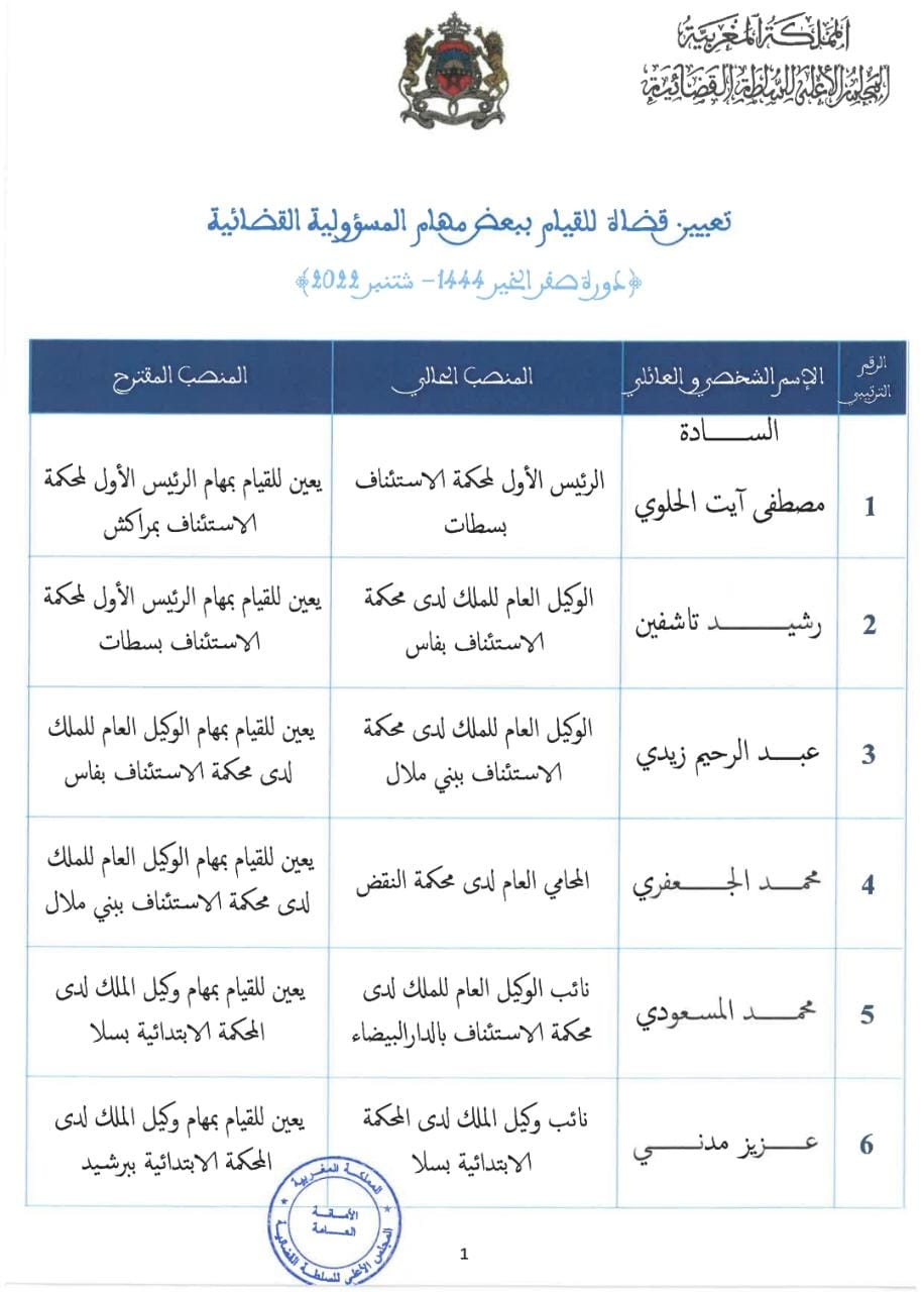 وحسب ماجاء في بلاغ للمجلس الأعلى للسلطة القضائية، توصلت به “كاب24” أن هذه التعيينات شملت ستة (06) مسؤولين قضائيين ببعض محاكم المملكة، إثنان منهم في مهمة الرئيس الأول بكل من محكمتي الاستئناف بمراكش وسطات، وإثنان في مهمة الوكيل العام للملك لدى كل من محكمتي الاستئناف بفاس وبني ملال، وإثنان آخران في مهمة وكيل الملك لدى كل من المحكمتين الابتدائيتين بسلا وبرشيد.