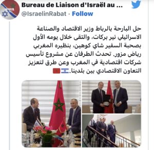 أكد مكتب الإتصال الإسرائيلي بالرباط عشية يومه الأربعاء ، النبأ الذي كان لكاب 24 السبق في نشره في مقال سابق قبل تلاتة أيام ” أنقر هنا للإطلاع “، المتعلق بتعيين ” شاي كوهين ” رئيسا لمكتب الإتصال الإسرائيلي بالمغرب ، خلفا لدفيد غوفرين .