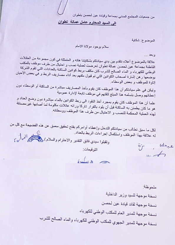 وجهت مجموعة من جمعيات المجتمع المدني بجماعة عين الحصن شكاية مباشرة إلى عامل عمالة تطوان، توصلت قناة كاب 24 بنسخة منها بعد أن تعرضت العديد من العائلات لعملية نصب وإحتيال من طرف موظف بالمكتب الوطني للماء والكهرباء كان مكلفا بملفات ربط العدادات بمنازل المواطنين بعد قبول ملفاتهم. وبعدم إعطاءهم وصل الأداء بالرغم من أخده المصاريف مباشرة منهم.
