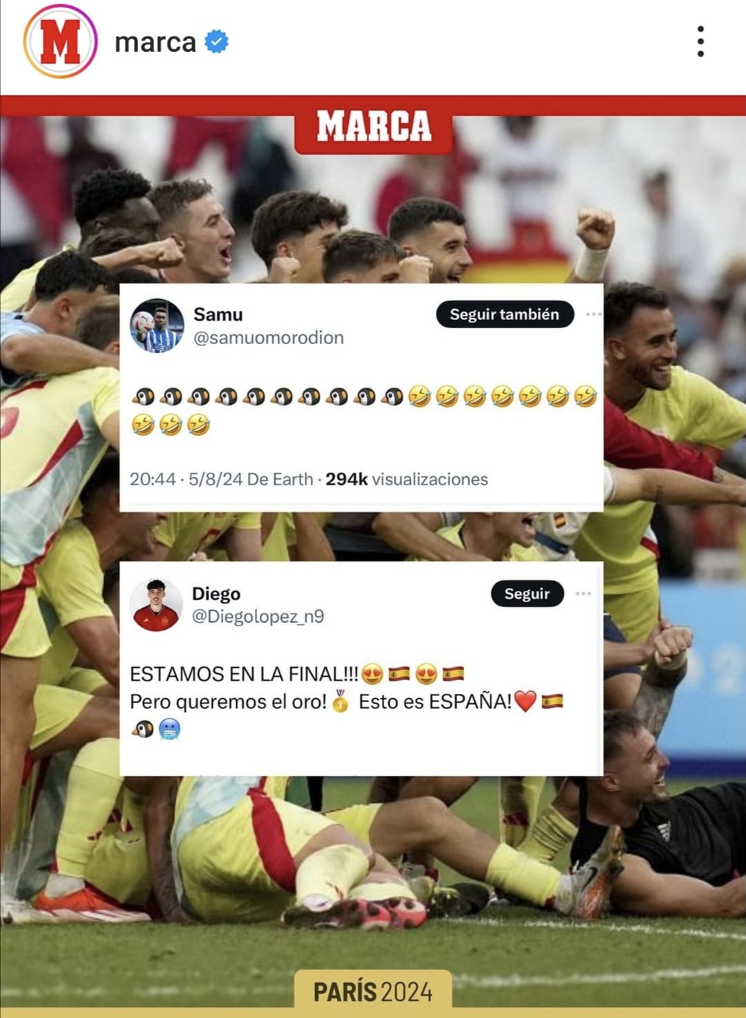 حركة حكيمي التي أظهرت مهاراته الفائقة، تم استغلالها من قبل بعض اللاعبين الإسبان كمصدر للسخرية، حيث قاموا بنشرها مع تعليقات طريفة تعكس روح الدعابة والمنافسة بينهم، اذ قام المهاجم سامو أمورديون بوضع عدة إيموجيات على حسابه بموقع “إكس”، تشير إلى البطريق وضحكات ساخرة، في حين نشر زميله دييغو لوبيز تغريدة ذكر فيها “نحن في النهائي، لأننا نريد الذهب، هذه إسبانيا”، واضعاً بدوره إيموجي البطريق ووجه متجمد.