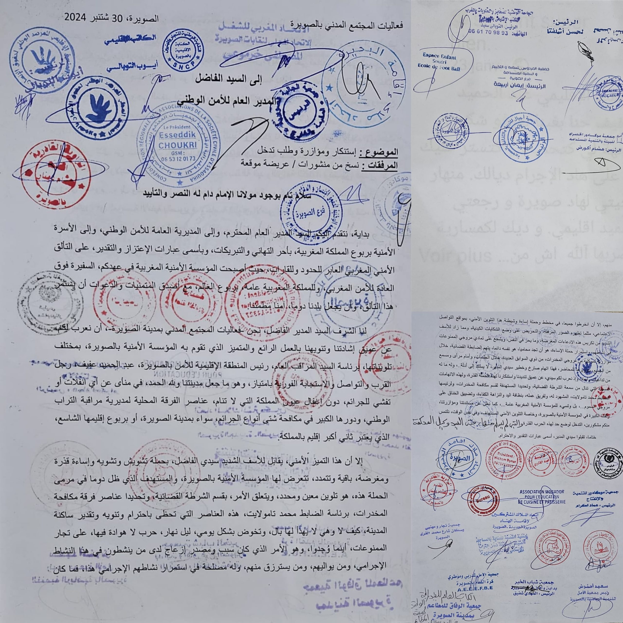 أمام تزايد حدة التشهير والإساءة التي أصبحت تتعرض لها المؤسسة الأمنية بالصويرة، والتي آستهدفت بالتحديد، المراقب العام رئيس المنطقة الإقليمية للأمن، وضباط من قسم الشرطة القضائية، خاصة عناصر فرقة مكافحة المخدرات، بل ولم تسلم من الحملة هذه حتى المؤسسة القضائية، وذلك بآستهداف بعض القضاة، ووكيل الملك لدى المحكمة الإبتدائية للصويرة، بموقع التواصل الإجتماعي “فايسبوك”، بالإضافة إلى شكايات كيدية أُرسلت لبعض المصالح المركزية، تتضمن العديد من الإتهامات الكاذبة والمغرضة في حق المستهدفين هؤلاء…، قررت العديد من الهيآت، نقابية وحقوقية وجمعوية بمدينة الصويرة، قارب عددها الأربعين هيأة، التوقيع على عريضة تنديد وآستنكار للحملة هذه، “نتوفر على نسخة منها”، وفي نفس الآن، تضمنت تنويها وإشادة بصرامة وحزم ونزاهة المصالح المستهدفة، وهو ما جعلها في مرمى النيران…، كما طالب المنتفضون من الجهات المختصة، التدخل الفوري لوضع حد لمسلسل الإساءة هذا، الباق والمتمدد.