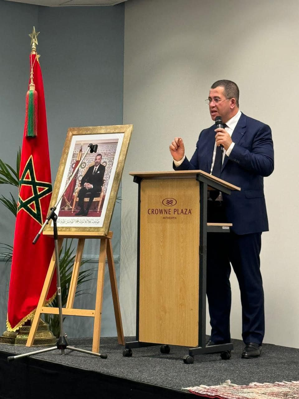 من جانبه، ألقى منير اقطيطو، القنصل العام للمملكة المغربية في أنفيرس، كلمة عبر فيها عن أهمية هذه الذكرى بالنسبة للمغاربة في بلجيكا، مشيراً إلى أن الاحتفال بعيد الاستقلال يعكس التلاحم المستمر بين العرش والشعب المغربي. كما أضاف أن المغرب يواصل تعزيز منجزاته الكبيرة في مجالات الأمن والتنمية، وهو ما جعل التجربة المغربية نموذجاً يحتذى به على الصعيدين الجهوي والدولي. وأبرز أيضاً نجاح القنصلية في تبسيط وتطوير إجراءات المعاملات القنصلية، مما يسهم في خدمة الجالية المغربية بفاعلية أكبر.