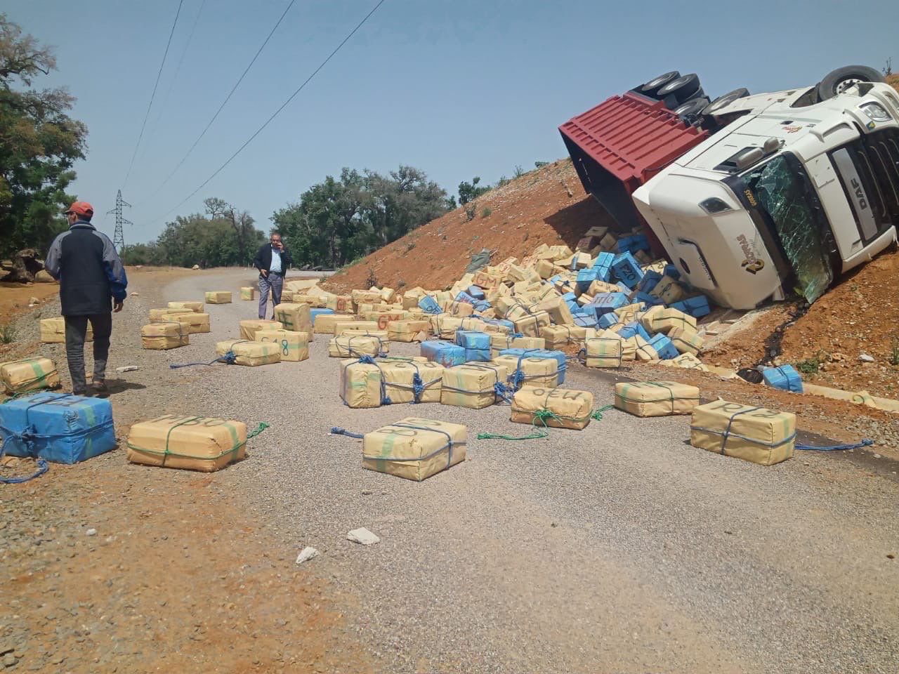 المعطيات الأولية تفيد بأن الشاحنة المحملة بـ10 أطنان من الشيرا، فقدت توازنها على مستوى أحد المنعرجات، مما أدى إلى انقلابها بشكل مفاجئ، دون تسجيل إصابات بشرية. غير أن المفاجأة لم تكن في الحادث ذاته، بل في محتوى الشاحنة الذي سرعان ما استنفر الأجهزة الأمنية والدرك الملكي.