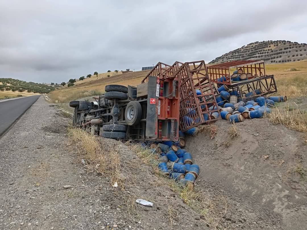 وأفادت مصادر محلية بأن الحادث نتج عن فقدان السائق السيطرة على الشاحنة في منعرج خطير، ما أدى إلى انقلابها وتناثر قنينات الغاز على جنبات الطريق.