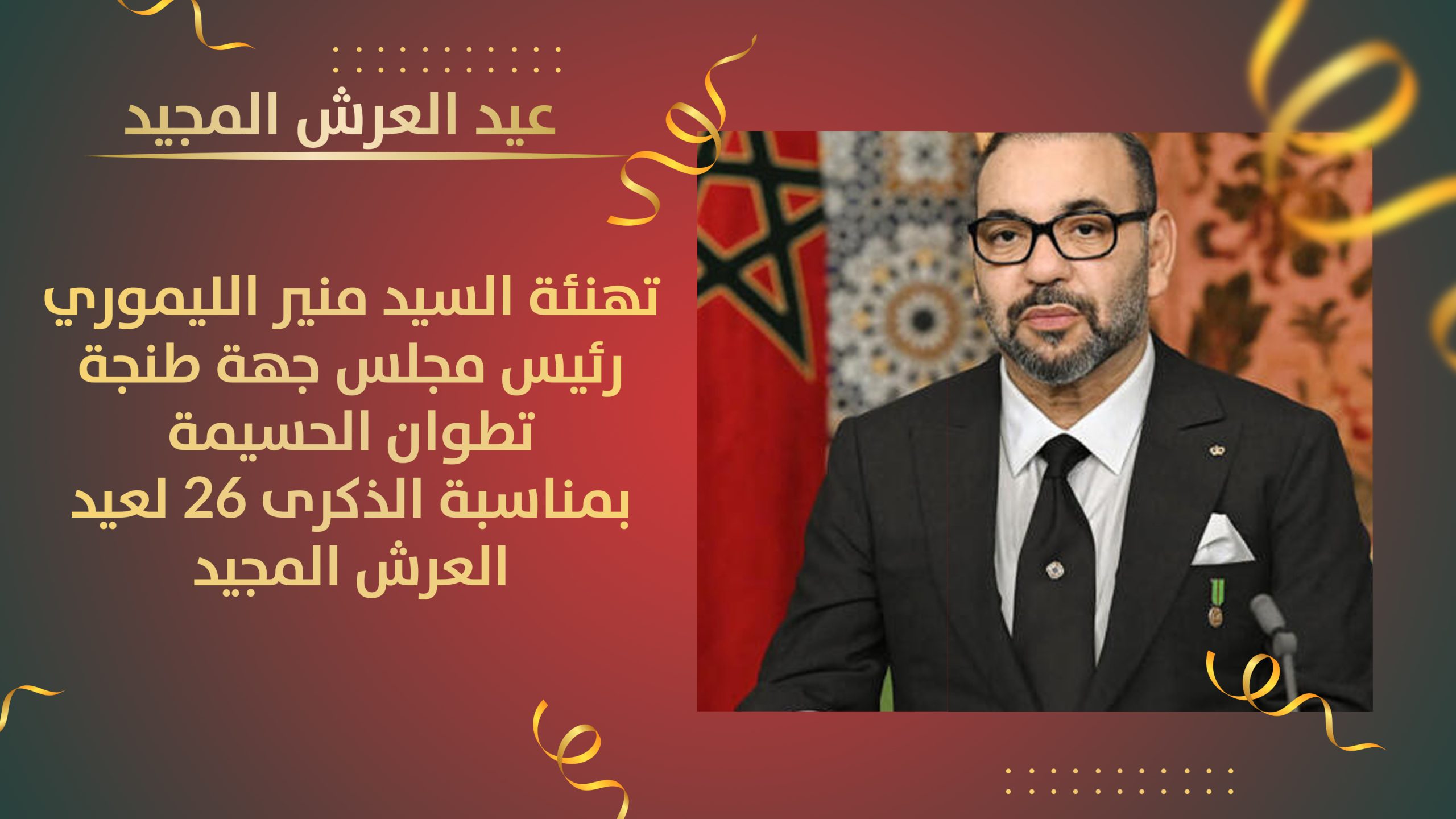 بمناسبة حلول الذكرى 26 لتربع صاحب الجلالة الملك محمد السادس نصره الله على عرش أسلافه المنعمين، يتشرف السيد منير الليموري رئيس جماعة طنجة بتقديم أحر التهاني وأطيب الأماني إلى السدة العالية بالله وكافة الأسرة العلوية الشريفة.