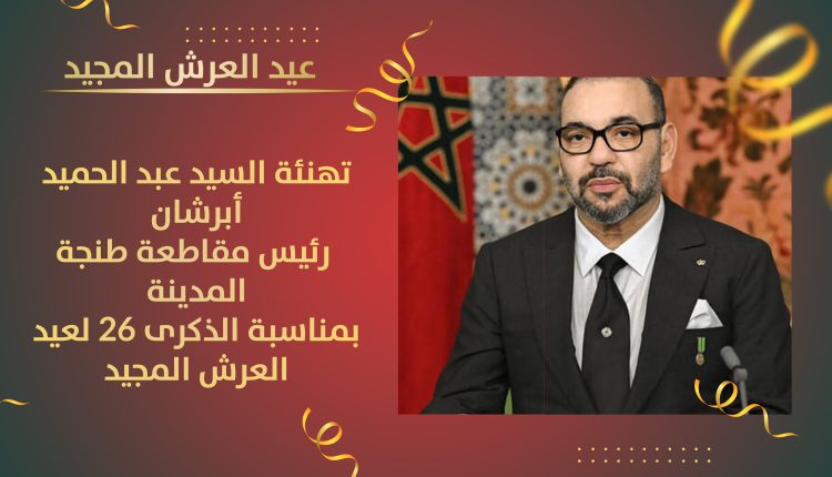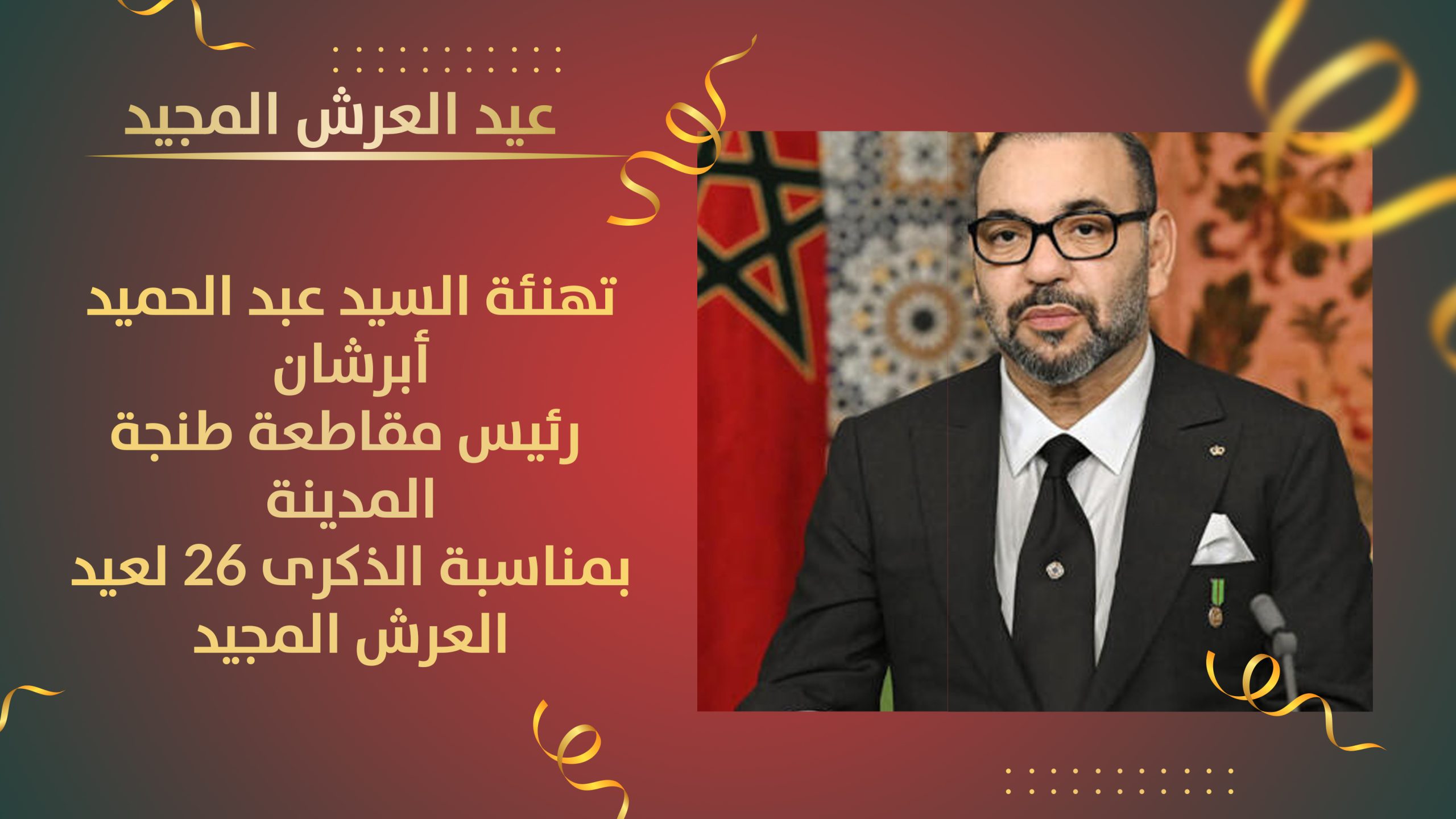 بمناسبة الذكرى السادسة والعشرين لتربع جلالة الملك محمد السادس نصره الله على عرش أسلافه الميامين، يتشرف السيد عبد الحميد أبرشان، رئيس مقاطعة طنجة المدينة، بأن يتقدم إلى السدة العالية بالله بأحر التهاني وأصدق عبارات الولاء والإخلاص، راجيًا من الله عز وجل أن يمد في عمر جلالته ويديم عليه نعمة الصحة والعافية.