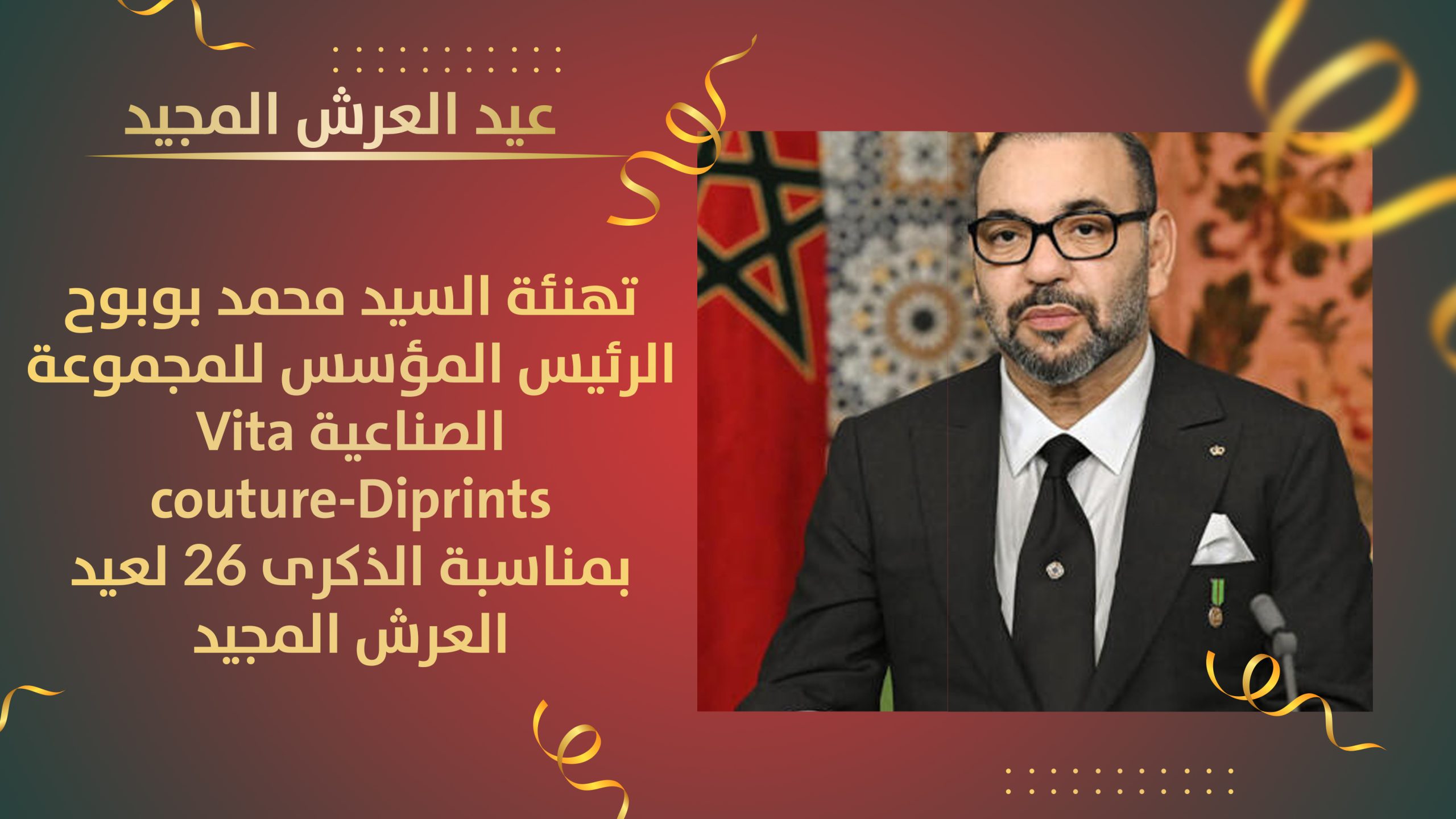 بمناسبة الذكرى السادسة والعشرين لتربع جلالة الملك محمد السادس نصره الله على عرش أسلافه الميامين، يتشرف السيد محمد بوبوح، الرئيس المؤسس للمجموعة الصناعية Vita couture-Diprints، بأن يتقدم إلى السدة العالية بالله بأحر التهاني وأصدق عبارات الولاء والإخلاص، راجيًا من الله عز وجل أن يمد في عمر جلالته ويديم عليه نعمة الصحة والعافية.