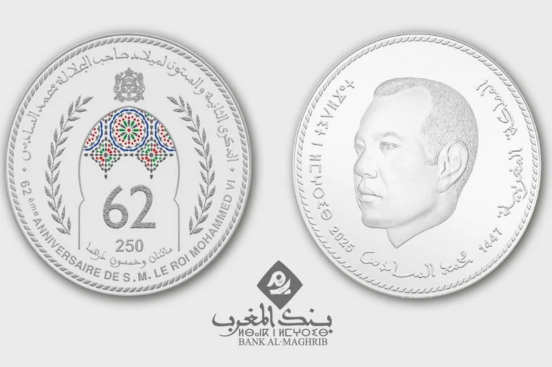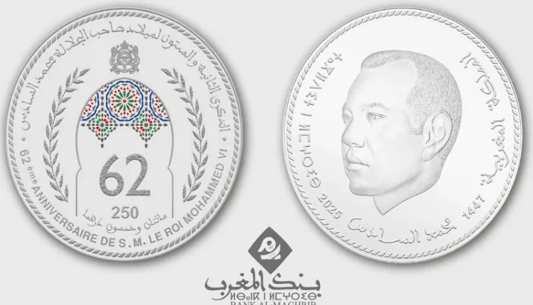 أصدر بنك المغرب قطعة نقدية تذكارية فضية من فئة 250 درهما، وذلك تخليدا للذكرى الثانية والستين لميلاد صاحب الجلالة الملك محمد السادس.