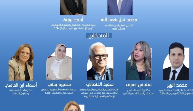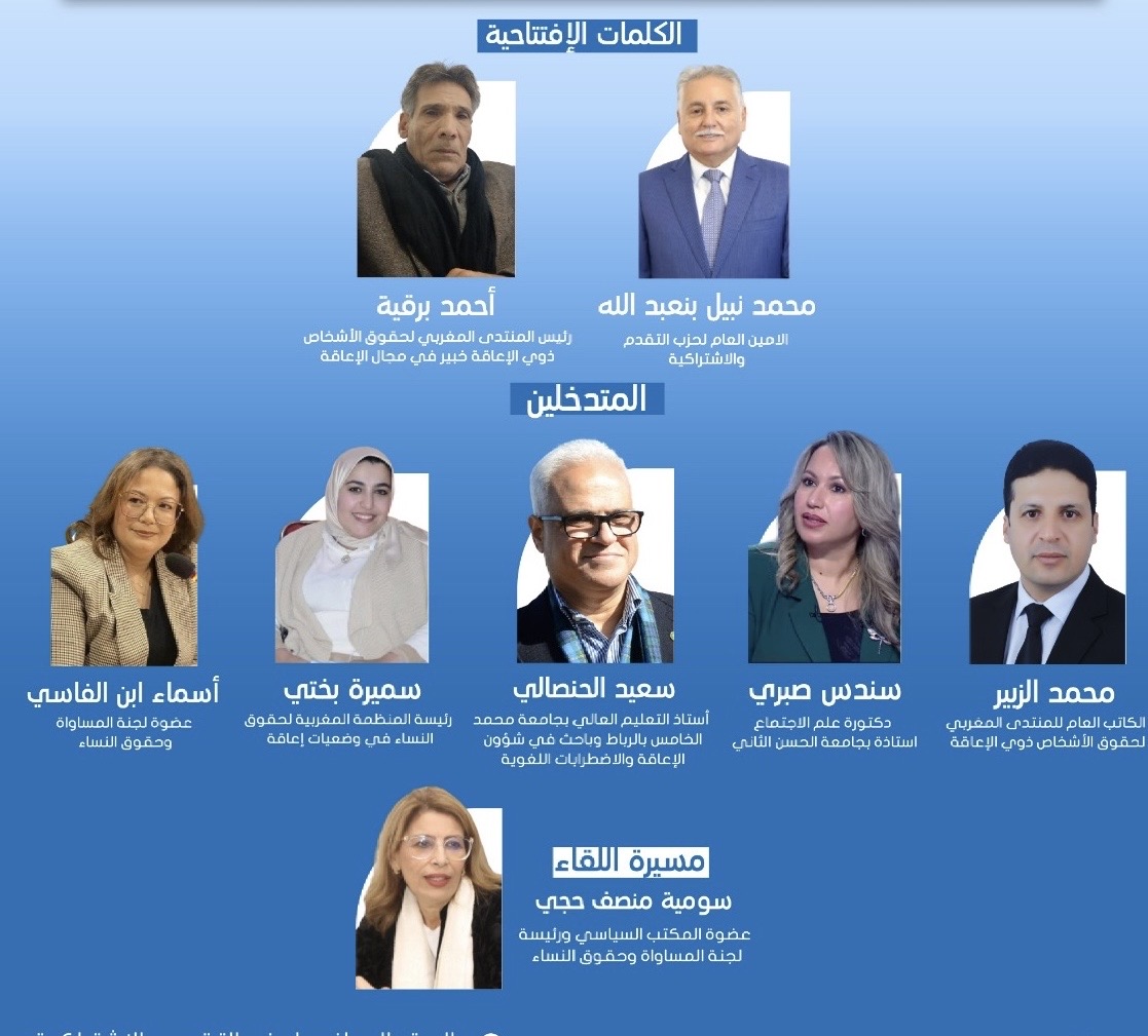 في إطار تعزيز المشاركة السياسية للأشخاص في وضعية إعاقة، وتنزيلا لمبادئ المساواة وعدم التمييز، تنظم لجنة المساواة وحقوق النساء – فضاء أطر الرباط، بتنسيق مع المنظمة المغربية لحقوق المرأة في وضعية إعاقة، لقاء فكريا وترافعيا حول: